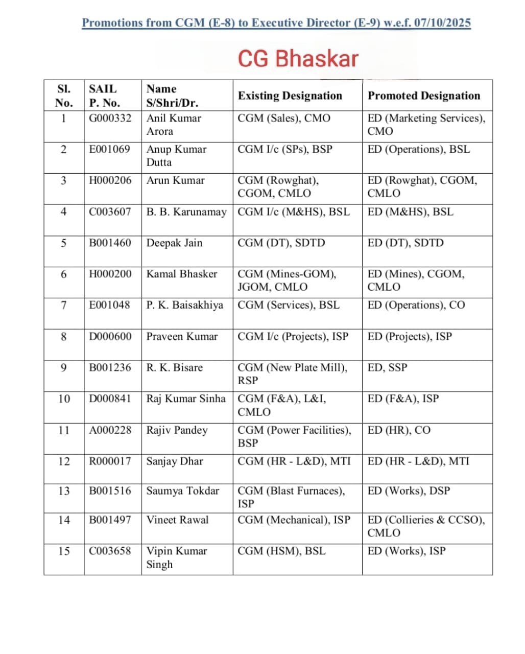 सीजी भास्कर, 07 अक्टूबर। स्टील अथॉरिटी ऑफ इंडिया (SAIL) के 15 सीजीएम प्रमोट हो एग्जीक्यूटिव डायरेक्टर बनाए गए हैं। अधिकारियों की प्रमोशन लिस्ट आते ही हर्ष का माहौल है। (Pramotion in SAIL)