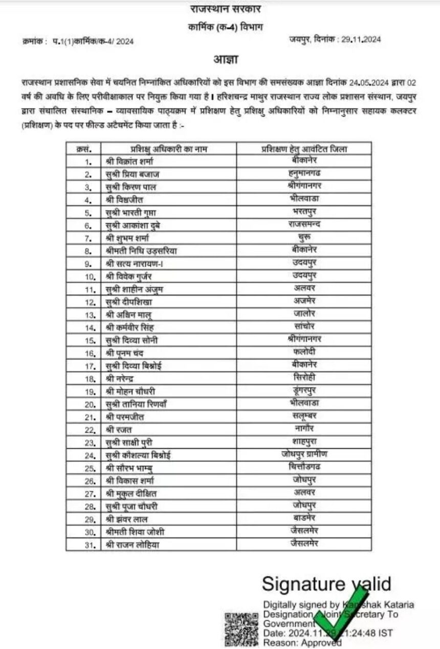 सीजी भास्कर, 30 नवंबर। राजस्थान प्रशासनिक सेवा (RAS) के दो वर्ष के परीवीक्षाकाल पर चल रहे 75 चयनितों को जिलों में सहायक कलेक्टर बनाया गया है। इन्हें 24 मई 2024 को दो वर्ष के लिए परीवीक्षाकाल पर चयनित किया गया था, अब पहली फील्ड पोस्टिंग दी गई है। ये नए आरएएस अधिकारी 24 मई 2024 से हरिश्चन्द्र माथुर लोक प्रशासन संस्थान में प्रशिक्षण ले रहे थे। अब इन सभी को सहायक कलेक्टर (प्रशिक्षण) पद पर फील्ड में अटैच किया गया है। सभी को नव पदस्थापित जिलों में 2 दिसंबर को उपस्थिति देनी है। देखिए सूची