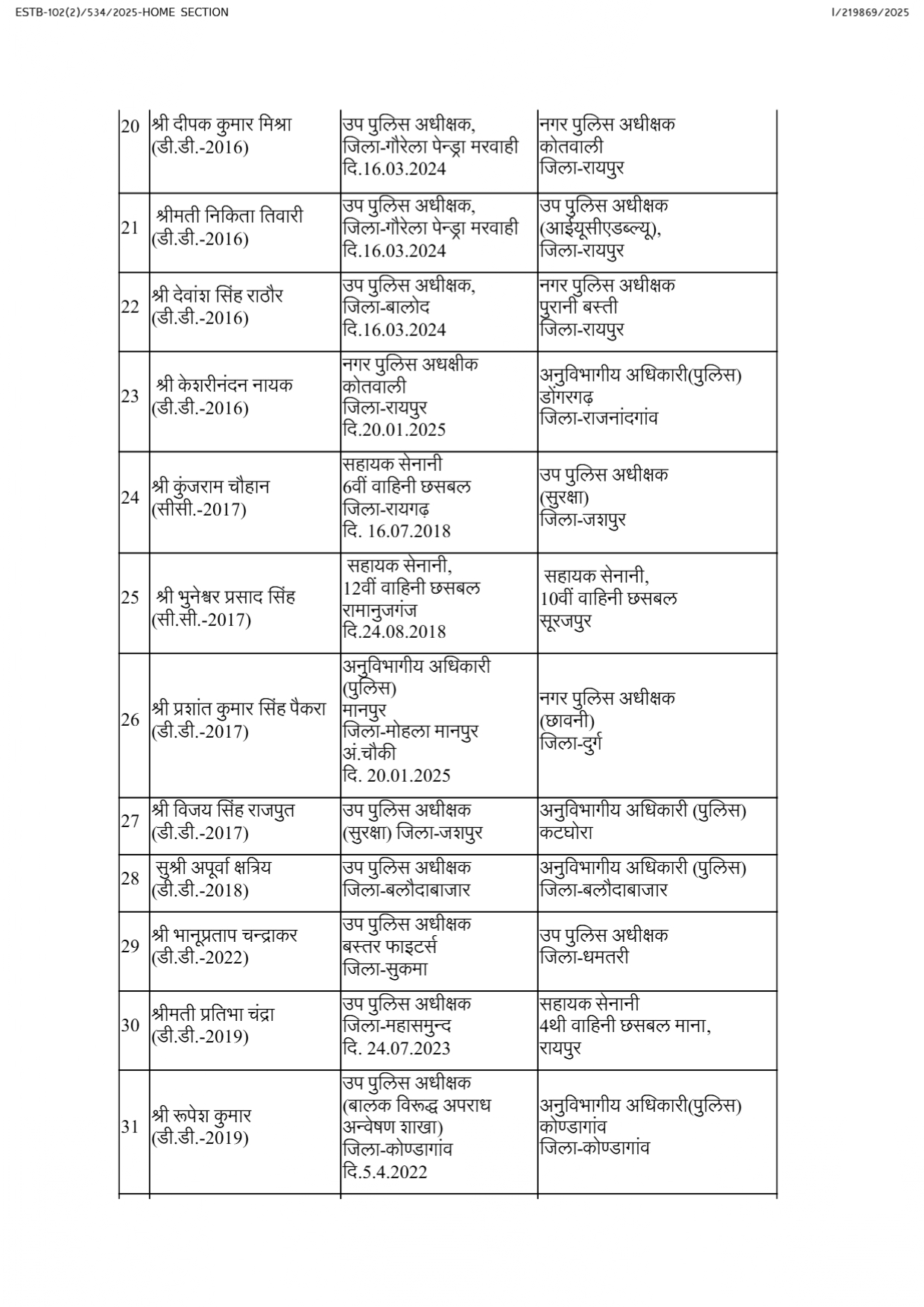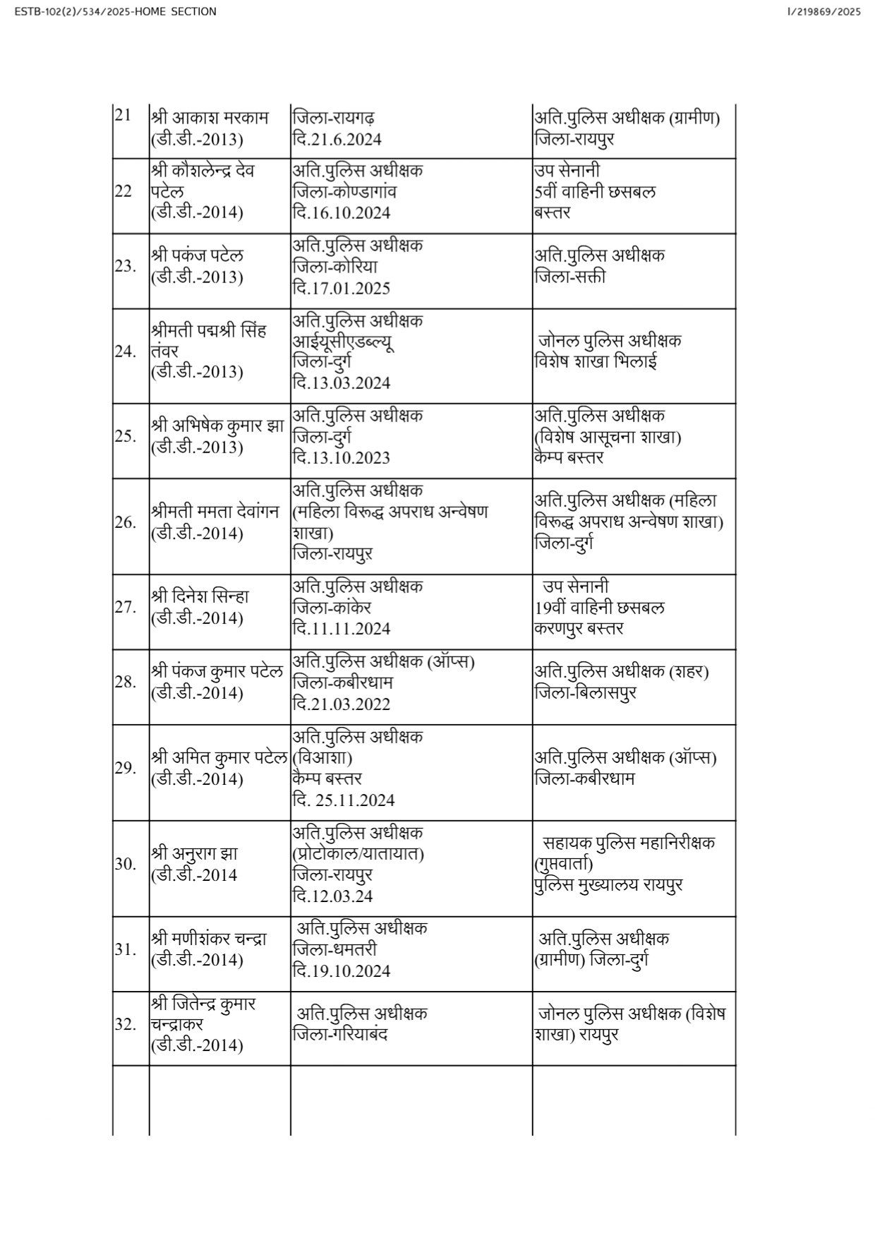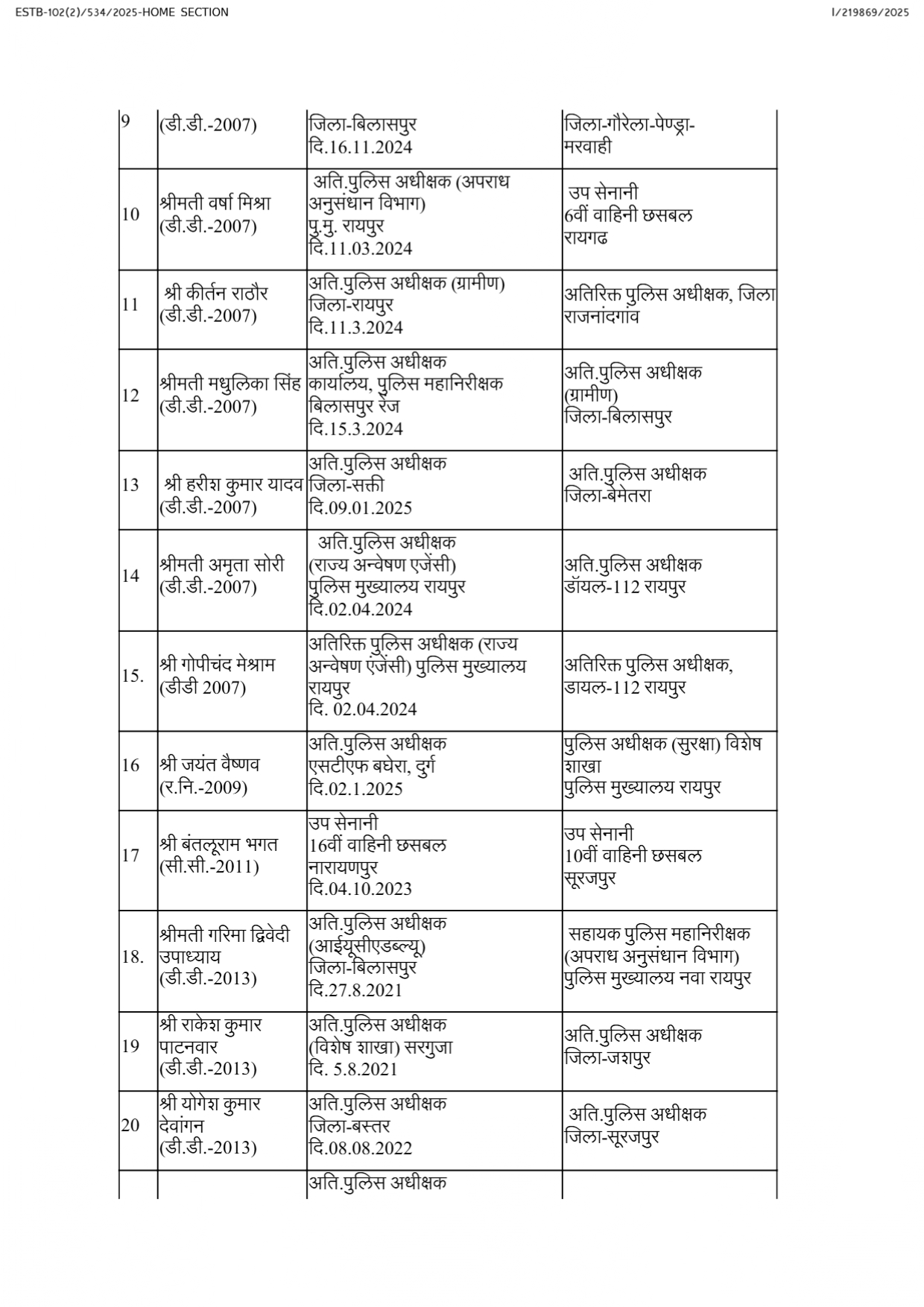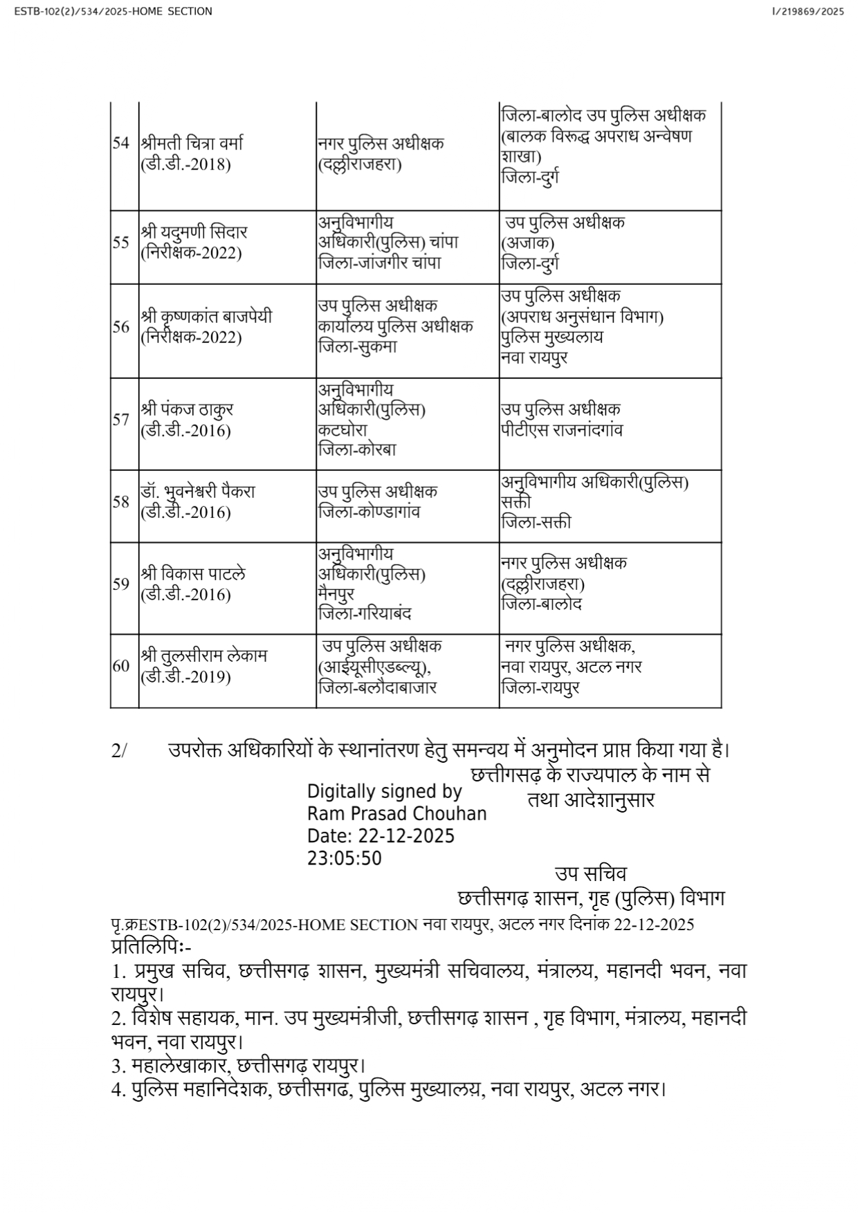 सीजी भास्कर, 23 दिसंबर। छत्तीसगढ़ शासन के गृह (पुलिस) विभाग ने भारतीय पुलिस सेवा और राज्य पुलिस सेवा (ASP DSP Transfer) के अधिकारियों की नई पदस्थापना के आदेश जारी किए हैं। नवा रायपुर स्थित मंत्रालय से 22 दिसंबर 2025 को जारी आदेश के अनुसार तीन आईपीएस अधिकारियों को नई जिम्मेदारियां सौंपी गई हैं। साथ ही, 35 अतिरिक्त पुलिस अधीक्षक और 60 उप पुलिस अधीक्षकोंके भी तबादले किए गए हैं।