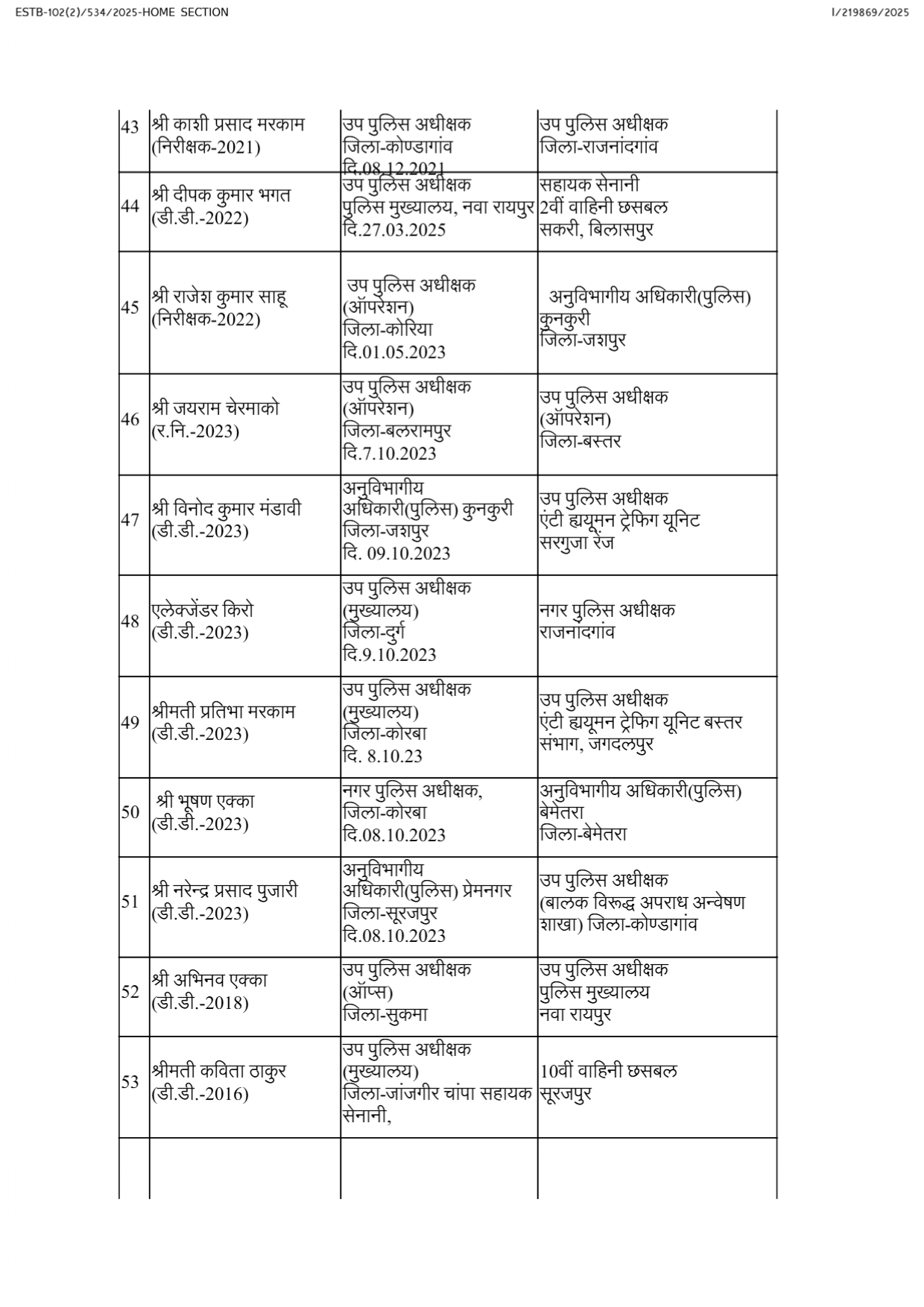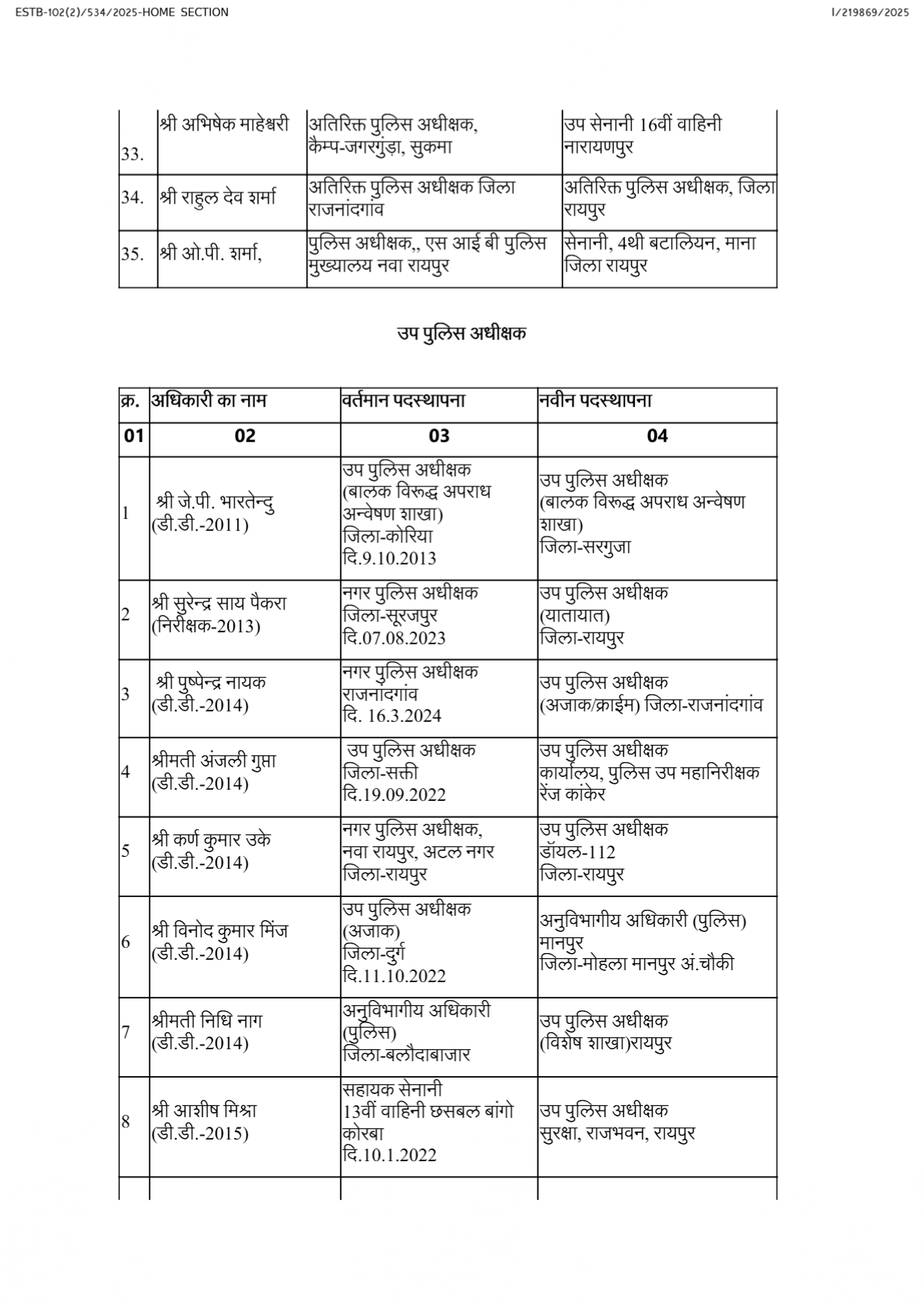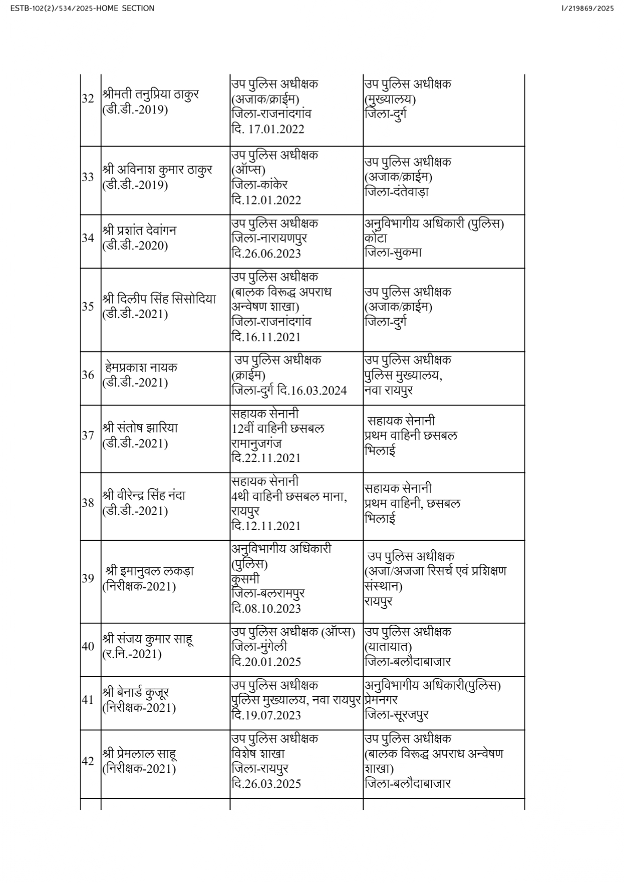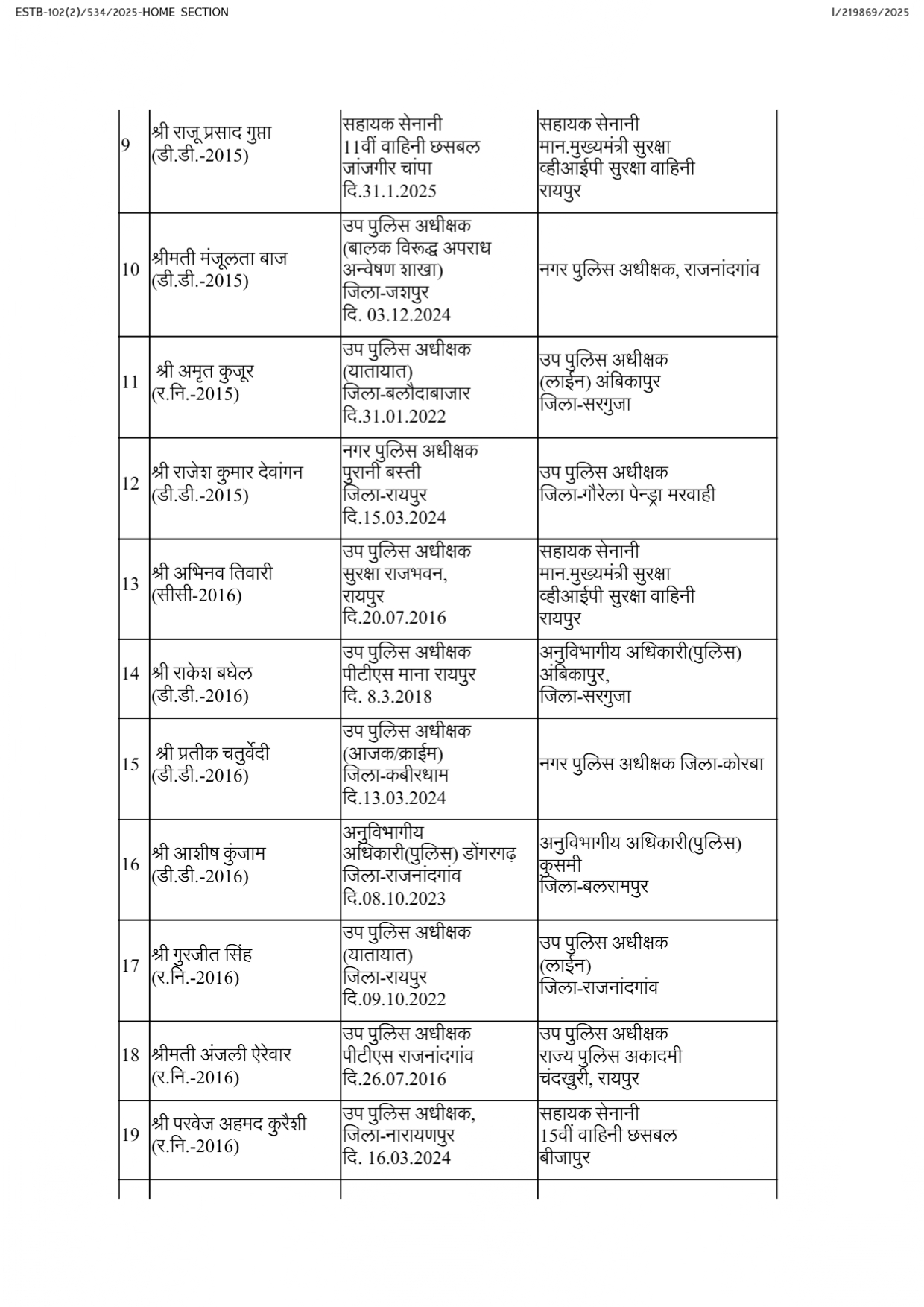 सीजी भास्कर, 23 दिसंबर। छत्तीसगढ़ शासन के गृह (पुलिस) विभाग ने भारतीय पुलिस सेवा और राज्य पुलिस सेवा (ASP DSP Transfer) के अधिकारियों की नई पदस्थापना के आदेश जारी किए हैं। नवा रायपुर स्थित मंत्रालय से 22 दिसंबर 2025 को जारी आदेश के अनुसार तीन आईपीएस अधिकारियों को नई जिम्मेदारियां सौंपी गई हैं। साथ ही, 35 अतिरिक्त पुलिस अधीक्षक और 60 उप पुलिस अधीक्षकोंके भी तबादले किए गए हैं।