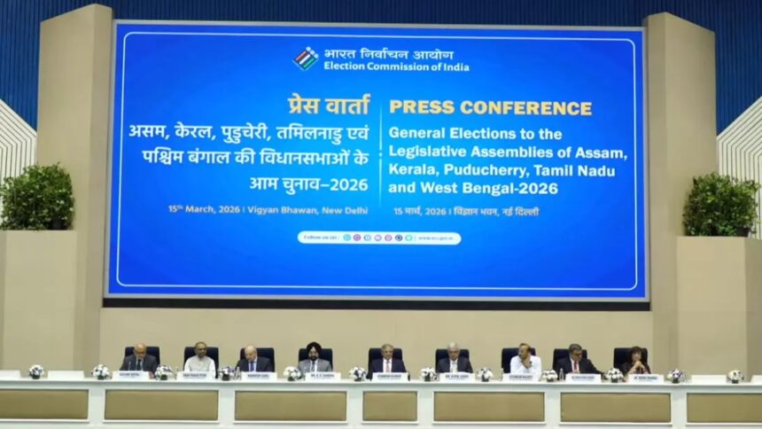 सीजी भास्कर, 15 मार्च। देश के पांच अहम चुनावी राज्यों में विधानसभा चुनाव की तारीखों का ऐलान (Assembly Polls 2026) हो गया है। चुनाव आयोग ने असम, केरल, तमिलनाडु, पश्चिम बंगाल और पुडुचेरी के लिए मतदान कार्यक्रम जारी कर दिया है। इसके साथ ही इन राज्यों में राजनीतिक सरगर्मी तेज हो गई है। इस बार सबसे खास बात यह है कि जहां असम, केरल और पुडुचेरी में एक ही दिन मतदान होगा, वहीं पश्चिम बंगाल में दो चरणों में वोट डाले जाएंगे।