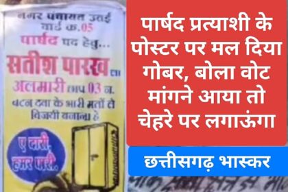 पार्षद प्रत्याशी के पोस्टर पर गोबर पोतने वाले ने कहा – “अगर वोट मांगने आया तो चेहरे पर गोबर लगाउंगा” मामला उधारी लेन-देन का, सीसीटीवी में कैद हुआ घटनाक्रम