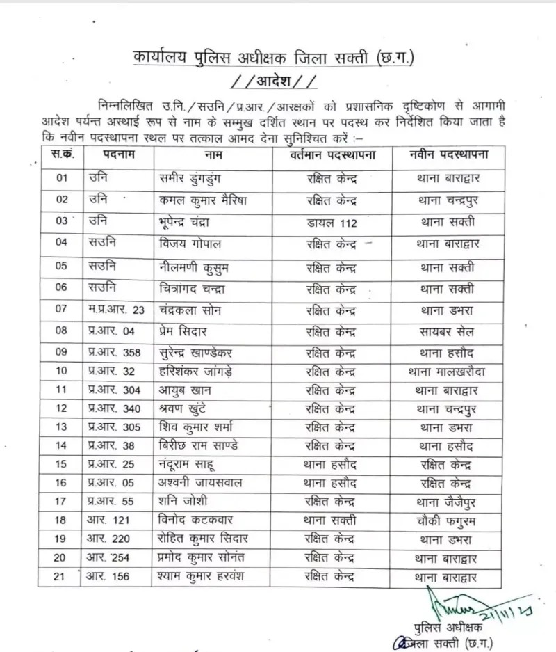 सीजी भास्कर, 23 नवंबर। सक्ती जिले में पुलिस विभाग में एक अहम प्रशासनिक बदलाव किया गया है। पुलिस सुपरिटेंडेंट प्रफुल्ल ठाकुर (CG Police Transfer) ने जिले का चार्ज संभालने के बाद अपना पहला ट्रांसफर ऑर्डर जारी किया है, जिसमें कुल 21 पुलिसकर्मियों का तबादला (Police Transfer List) शामिल है।