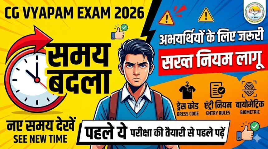 ड्रेस कोड को लेकर भी सख्त निर्देश जारी किए गए हैं। अभ्यर्थियों को हल्के रंग के आधी बांह वाले कपड़े पहनकर परीक्षा देना होगा, जबकि काले, गहरे नीले, हरे, जामुनी, मैरून और चॉकलेटी रंग के कपड़े पूरी तरह प्रतिबंधित रहेंगे। धार्मिक या सांस्कृतिक पोशाक पहनने वाले अभ्यर्थियों को अतिरिक्त समय लेकर पहले पहुंचना होगा और उन्हें विशेष सुरक्षा जांच से गुजरना पड़ेगा। यह नियम (CG Vyapam Exam Timing 2026) सभी के लिए अनिवार्य रहेगा।