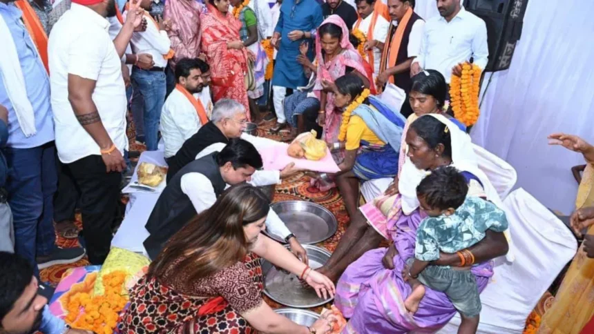 कार्यक्रम में सबसे भावुक पल तब आया जब विधायक भावना बोहरा ने घर लौटे सभी आदिवासी परिवारों के चरण धोए।