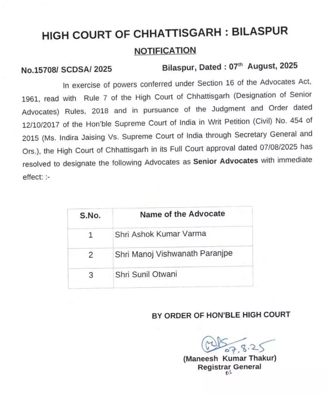 बिलासपुर, 8 अगस्त 2025 — छत्तीसगढ़ उच्च न्यायालय ने प्रदेश के न्यायिक क्षेत्र में एक महत्वपूर्ण कदम उठाते हुए तीन प्रतिष्ठित अधिवक्ताओं को वरिष्ठ अधिवक्ता (Senior Advocate) के रूप में नामित किया है। इस निर्णय को फुल कोर्ट की मंजूरी प्राप्त हुई है और यह आदेश तत्काल प्रभाव से लागू कर दिया गया है।