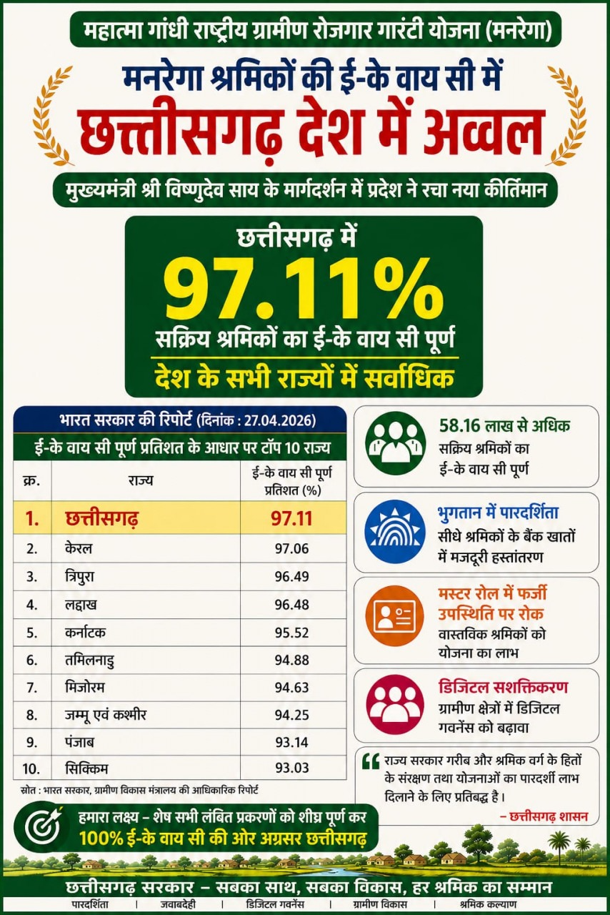 सीजी भास्कर, 27 अप्रैल : छत्तीसगढ़ ने विकास और पारदर्शिता के मामले में एक ऐसा नया कीर्तिमान स्थापित किया है, जिसने पूरे देश (Chhattisgarh MGNREGA e-KYC Record) का ध्यान अपनी ओर खींच लिया है। महात्मा गांधी राष्ट्रीय ग्रामीण रोजगार गारंटी योजना (मनरेगा) के तहत श्रमिकों के डिजिटल वेरिफिकेशन यानी e-KYC कार्य में छत्तीसगढ़ देश के सभी राज्यों को पीछे छोड़ते हुए प्रथम स्थान पर काबिज हो गया है। भारत सरकार की ताजा रिपोर्ट के मुताबिक, छत्तीसगढ़ ने 97.11 प्रतिशत सक्रिय श्रमिकों का e-KYC पूर्ण कर लिया है, जो कि राष्ट्रीय स्तर पर एक रिकॉर्ड है। इस बड़ी कामयाबी ने साबित कर दिया है कि ग्रामीण विकास और तकनीक के समन्वय में छत्तीसगढ़ अब देश का नेतृत्व कर रहा है ।
