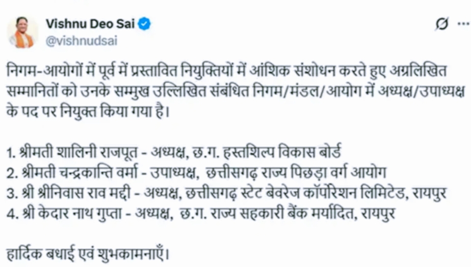 सरकार की ओर से किए गए नए बदलाव के तहत अब शालिनी राजपूत को अध्यक्ष छत्तीसगढ़ हस्तशिल्प विकास बोर्ड का अध्यक्ष, चंद्रकांति वर्मा को उपाध्यक्ष, छत्तीसगढ़ राज्य पिछड़ा वर्ग आयोग में श्रीनिवास राव मद्दी को अध्यक्ष, छत्तीसगढ़ स्टेट बेवरेज कॉर्पोरेशन लिमिटेड और केदारनाथ गुप्ता को अध्यक्ष छत्तीसगढ़ राज्य सहकारी बैंक मर्यादित बनाया गया है।