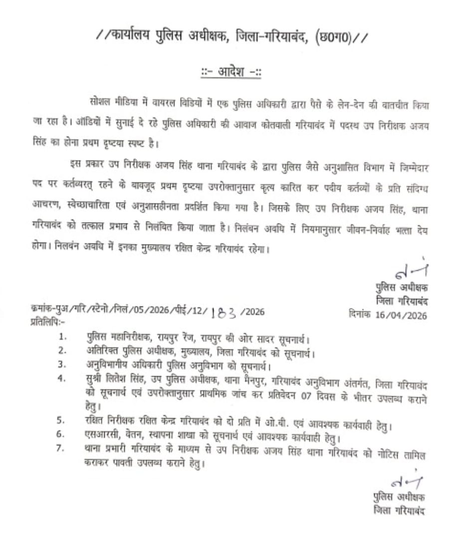 सीजी भास्कर, 16 अप्रैल : गरियाबंद जिले के सिटी कोतवाली में पदस्थ उप निरीक्षक पर रिश्वत लेकर केस दबाने का गंभीर आरोप (Gariaband Police Bribe Case) सामने आया है। मामला उजागर होते ही पुलिस अधीक्षक ने तुरंत कार्रवाई करते हुए आरोपी SI को निलंबित कर दिया है। सोशल मीडिया पर वायरल ऑडियो ने पूरे पुलिस महकमे में हड़कंप मचा दिया, जिसके बाद यह कार्रवाई की गई।