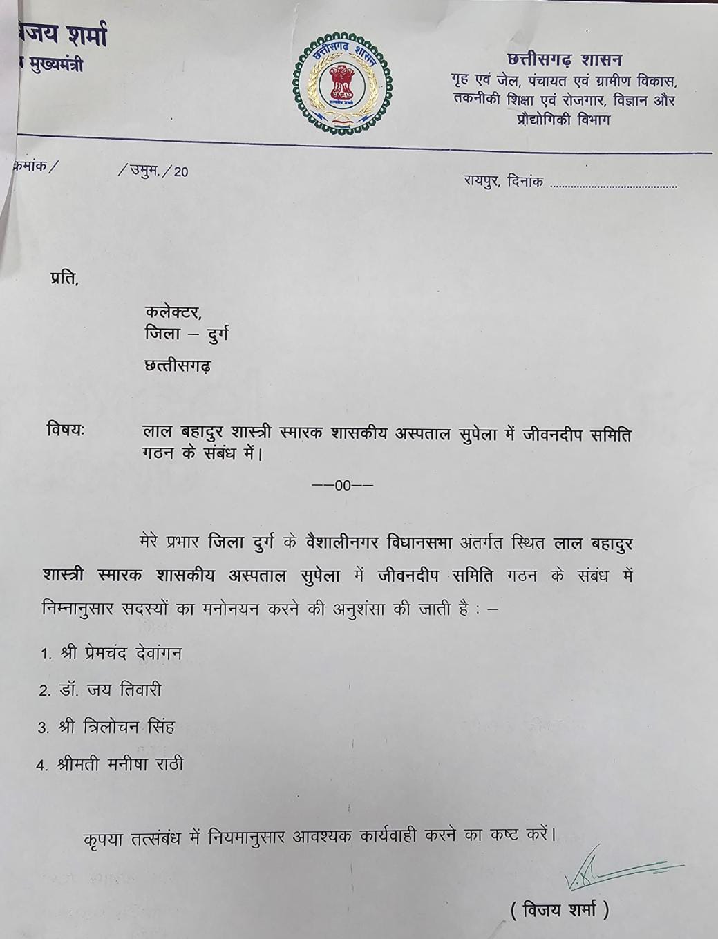 गृह, जेल, पंचायत एवं ग्रामीण विकास मंत्री विजय शर्मा के निर्देश पर वैशालीनगर विधानसभा अंतर्गत स्थित लाल बहादुर शास्त्री स्मारक शासकीय अस्पताल सुपेला में जीवनदीप समिति में प्रेमचंद देवांगन, डॉ. जय तिवारी, त्रिलोचन सिंह एवं श्रीमती मनीषा राठी को सदस्य नियुक्त किया गया है।