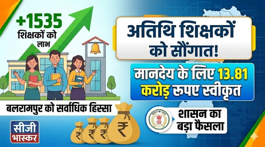 सीजी भास्कर, 28 अप्रैल : छत्तीसगढ़ शासन ने राज्य की शिक्षा व्यवस्था को और भी मजबूत करने की दिशा में एक बड़ा कदम उठाया है। प्रदेश के स्कूलों में अपनी सेवाएं दे रहे अतिथि शिक्षकों को बड़ी राहत देते हुए सरकार ने वित्तीय वर्ष 2026-27 के लिए 13.81 करोड़ (तेरह करोड़ इक्यासी लाख पचास हजार रुपये) की भारी-भरकम राशि को मंजूरी दे दी है। इस महत्वपूर्ण फैसले से (Guest Teacher Salary Chhattisgarh) से जुड़ी तमाम अड़चनें दूर होंगी और शिक्षकों को उनके काम का उचित पारिश्रमिक समय पर मिल सकेगा।