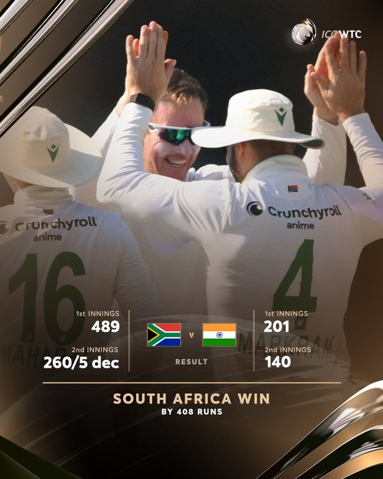 वर्ल्ड टेस्ट चैंपियन साउथ अफ्रीका ने भारत को दूसरी पारी में 140 रन पर समेट दिया और 408 रन से जीत दर्ज की। यह भारत की ओवरऑल टेस्ट में और घर पर रन के अंतर से सबसे बड़ी हार है। इससे पहले टीम इंडिया को 2004 में ऑस्ट्रेलिया ने नागपुर में 342 रन से हराया था।