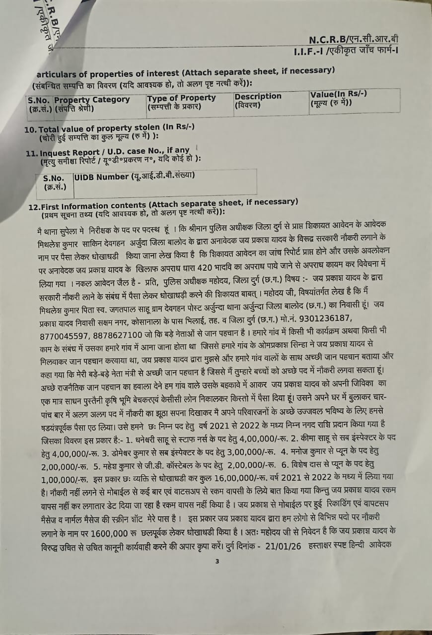 दुर्ग/भिलाई। Job Fraud Case Bhilai : सरकारी नौकरी दिलाने के नाम पर लाखों रुपये की ठगी का मामला सामने आया है। भिलाई क्षेत्र में खुद को बड़े नेताओं और मंत्रियों का करीबी बताने वाले एक व्यक्ति के खिलाफ धोखाधड़ी का अपराध दर्ज किया गया है। आरोप है कि उसने सब इंस्पेक्टर, जीडी कांस्टेबल, स्टाफ नर्स और प्यून जैसी नौकरियों का झांसा देकर ग्रामीणों से बड़ी रकम वसूली।