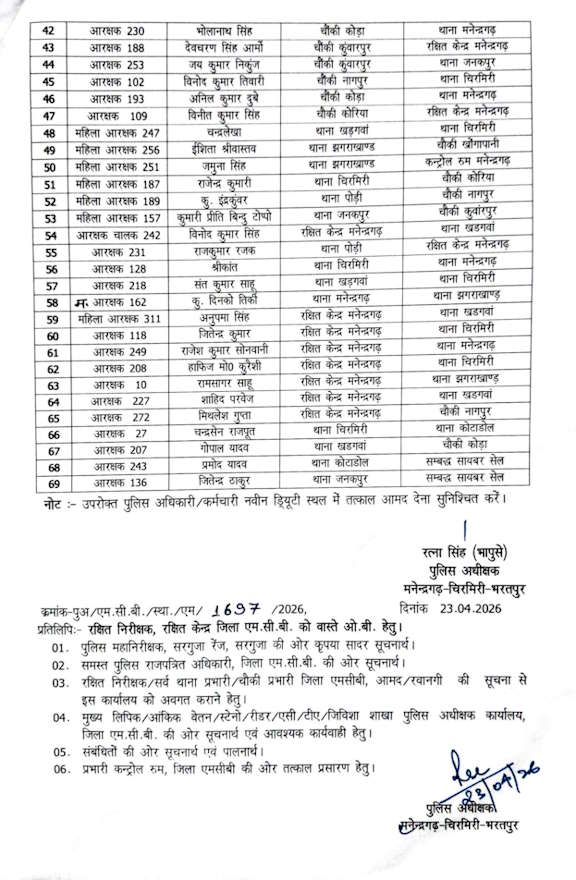 प्रशासनिक कसावट के लिहाज से मनेंद्रगढ़-चिरमिरी-भरतपुर पुलिस अधीक्षक रत्ना सिंह ने थोक में सहायक उप निरीक्षक, प्रधान आरक्षक और आरक्षकों का थोक में तबादला किया गया है. आदेश से 4 सहायक उप निरीक्षक, 13 प्रधान आरक्षक और 52 आरक्षक प्रभावित हुए हैं.