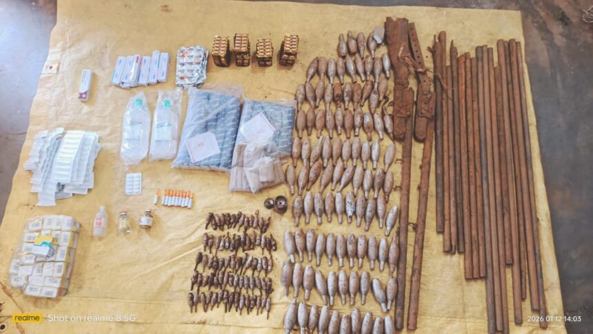 सीजी भास्कर, 13 जनवरी। छत्तीसगढ़ के नक्सल प्रभावित नारायणपुर जिले में नक्सल विरोधी अभियान (Narayanpur Naxal Dump Recovered) के तहत सुरक्षा बलों को बड़ी सफलता मिली है। डीआरजी और आईटीबीपी की संयुक्त टीम ने कोहकामेटा थाना क्षेत्र के अंदरूनी, दुर्गम और पहाड़ी इलाकों में चलाए गए सघन सर्च ऑपरेशन के दौरान नक्सलियों द्वारा छिपाकर रखा गया भारी मात्रा में नक्सल डंप बरामद किया है। बरामद डंप में हथियार, विस्फोटक सामग्री के साथ-साथ नक्सलियों के उपयोग में आने वाली दवाइयों की बड़ी खेप शामिल है, जिसे सुरक्षा बलों ने मौके से जब्त कर लिया है।