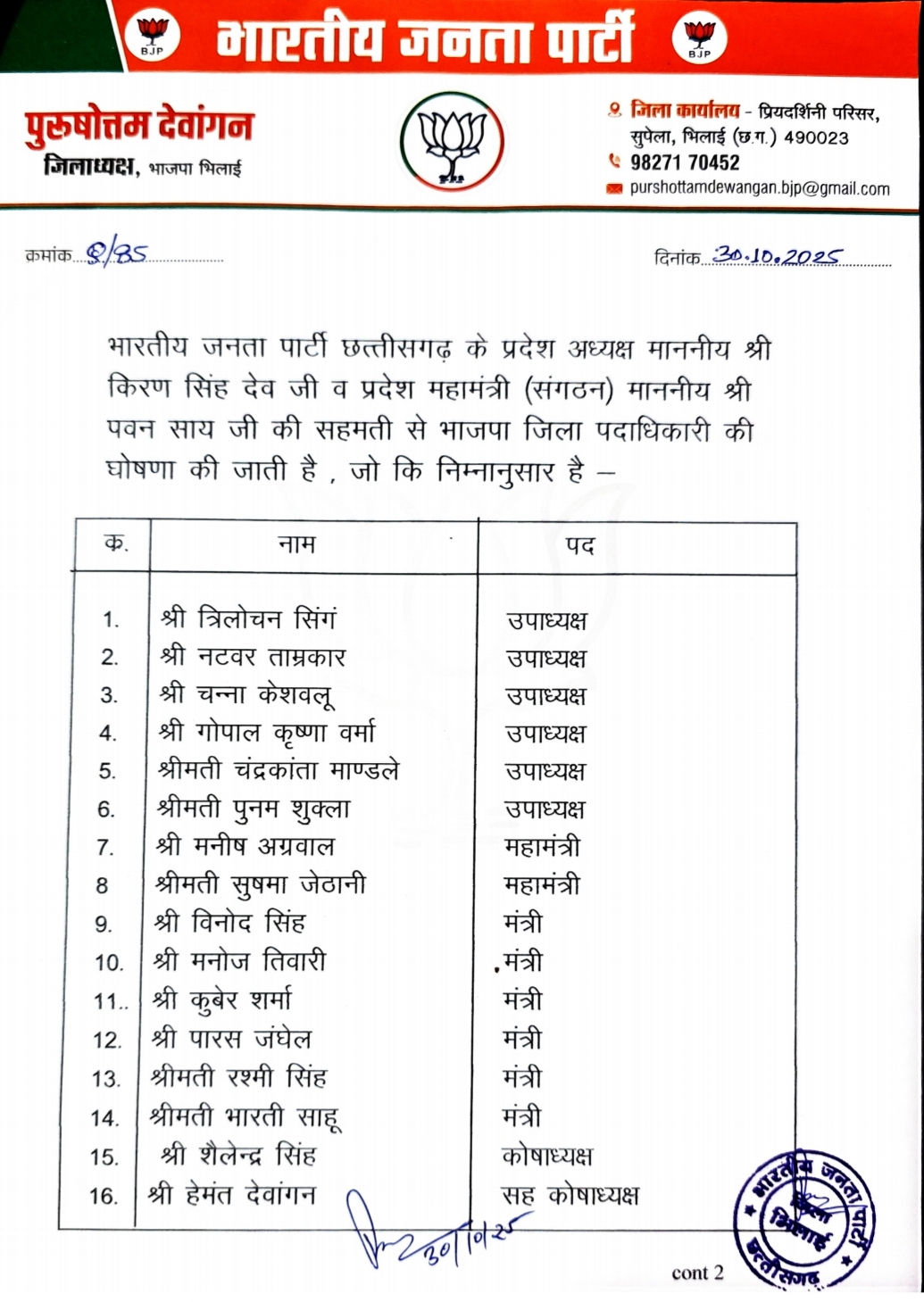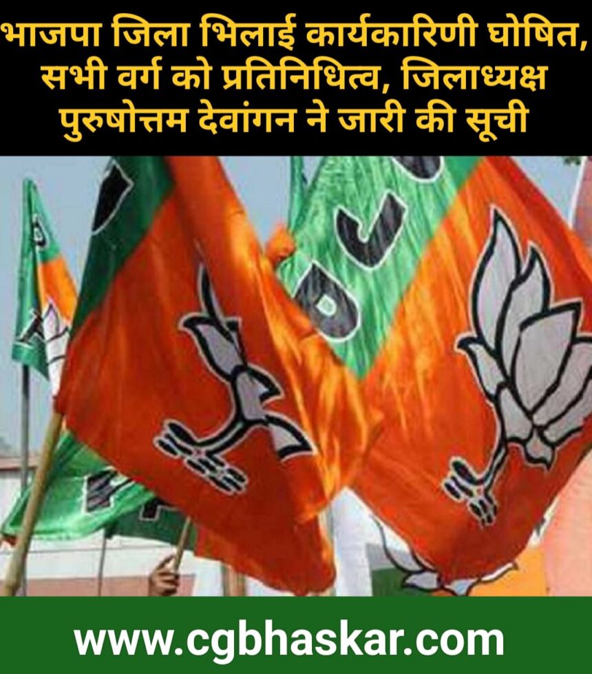 सीजी भास्कर, 31 अक्टूबर। भारतीय जनता पार्टी जिला भिलाई कार्यकारिणी अभी अभी घोषित कर दी गई है। भाजपा प्रदेश अध्यक्ष किरण सिंहदेव और संगठन मंत्री पवन साय से फायनल हुई सूची की घोषणा जिला अध्यक्ष भिलाई पुरूषोत्तम देवांगन ने कर दी है। (Bhilai District Executive Committee declared)