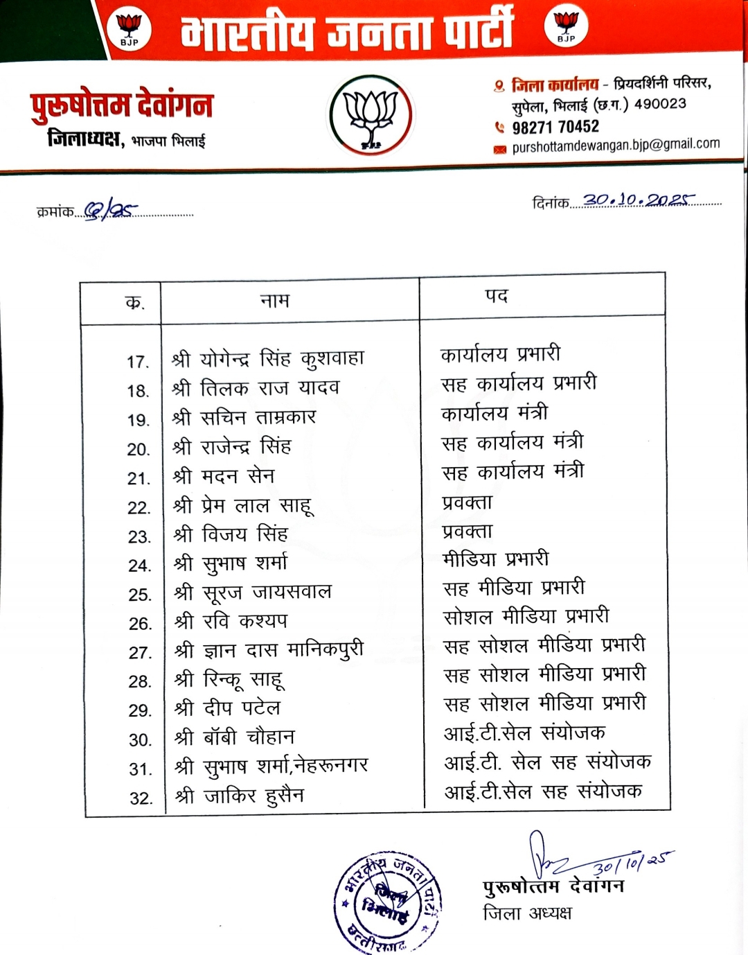 आपको बता दें कि भारतीय जनता पार्टी जिला भिलाई अध्यक्ष पुरूषोत्तम देवांगन की टीम में 32 सदस्यीय आलराउंडर भाजपा नेताओं को शामिल किया गया है।