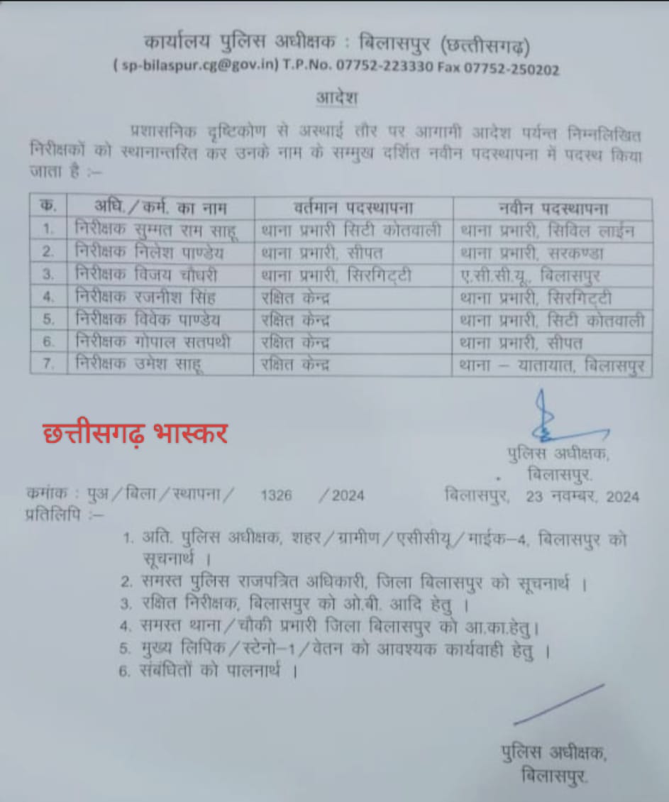 सीजी भास्कर, 23 नवंबर। छत्तीसगढ़ के बिलासपुर जिला एसपी रजनेश सिंह ने सात निरीक्षकों के तबादले का आदेश जारी किया है। इस तबादले में सिरगिट्टी, सिविल लाइन और सरकंडा थानों के प्रभारी प्रभावित हुए हैं।
