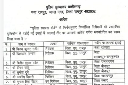 पुलिस विभाग की आ गई तबादला सूची, 6 इंस्पेक्टर और 3 सब इंस्पेक्टर हुए ट्रांसफर, 7 नक्सल प्रभावित जिलों में भेजे गए