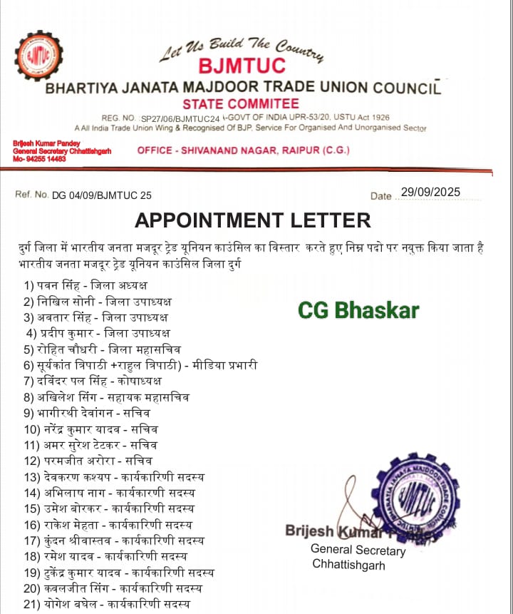 सीजी भास्कर, 30 सितंबर। प्रदेश महासचिव बृजेश पाण्डेय की सहमति बाद दुर्ग जिला में भारतीय जनता मजदूर ट्रेड यूनियन काउंसिल (BJMTUC) अध्यक्ष पवन सिंह ने अपनी कार्यकारिणी घोषित कर दी है। (President announced executive committee)