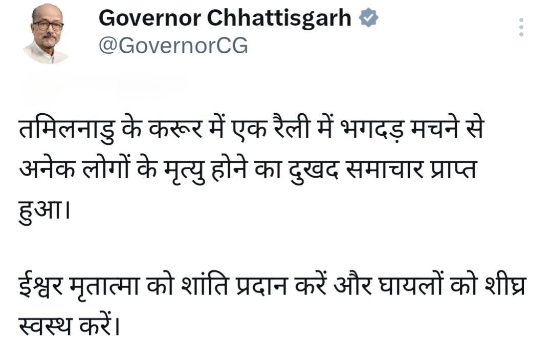 छत्तीसगढ़ के राज्यपाल रमेन डेका आज जुबीन गर्ग के श्रद्धांजलि कार्यक्रम में शामिल होने गुवाहाटी रवाना हुए हैं। उनका आज भिलाई रायपुर में आयोजित सभी कार्यक्रम कैंसल कर दिए गए हैं। इससे पूर्व राज्यपाल डेका ने तमिलनाडु के करूर में एक रैली में भगदड़ मचने से अनेक लोगों के मृत्यु होने पर मृतात्मा को शांति प्रदान करने और घायलों को शीघ्र स्वस्थ करने ईश्वर से कामना की।
